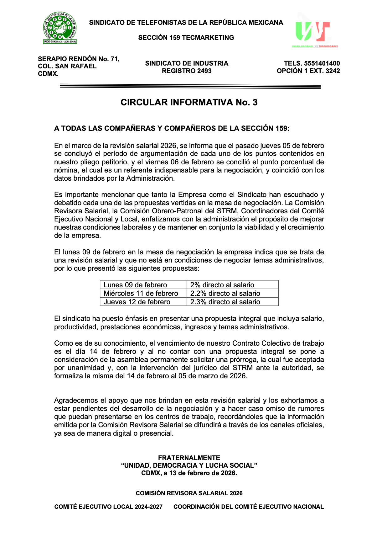 Se dan a conocer las propuestas salariales que la administración ha presentado al sindicato. Por lo anterior, se ha puesto énfasis en que la administración presente una propuesta integral que incluya salario, productividad, prestaciones económicas, ingresos y temas administrativos.